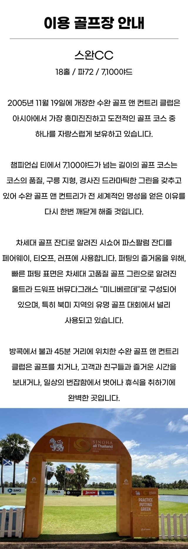 스완cc는 2005년 오픈한 코스로 아시안투어, 타일랜드오픈 등 여러 대회를 개최한 명문 골프장입니다. 특히나 캐디분들 실력이 좋아서 본인 스코어보다 좋은 기록을 낼 수 있는 신비의 골프장이랍니다 ㅎㅎ