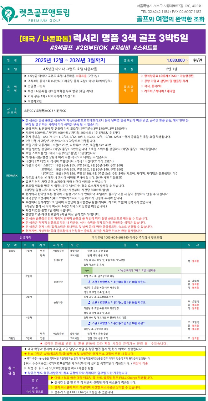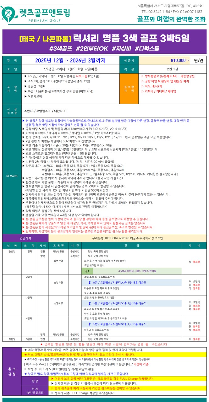📆 나콘파톰 3색 지상비 요금표 (1일 18홀 그린피 기준)