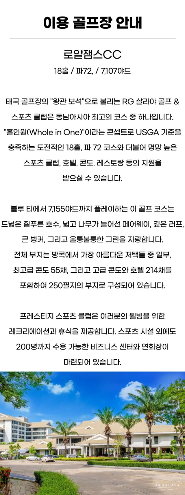 로얄잼스cc는 "로얄"이라는 단어답게 예전 왕실에서 사용하던 골프장으로 태국 최초로 타이오픈 대회가 열린 골프장이랍니다. 그래서 그런지 골프장이 거대한 정원같은 느낌으로 꾸며져 있어서 편안한 마음이 드는 골프장이였어요~