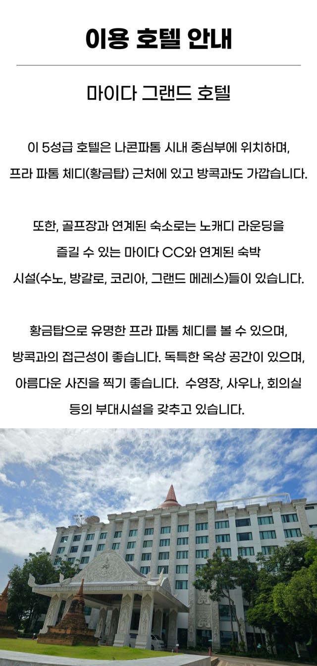 나콘파톰 지역에서 가장 좋은 마이다 호텔 입니다. 요즘 생긴 호텔에 비하면 응?? 이런 생각이 들수도 있는데 시설은 잘 되어 있어요~