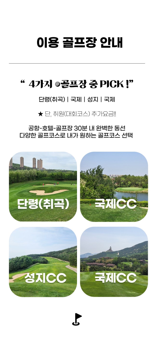 ▶ 중국 및 한국의 연휴기간시에는 골프장 운영 정책에 따라, 라운딩 티업 시간이 오전 이른 시간대로 앞당겨 조정될 수 있습니다. (현장에서 확인 가능)