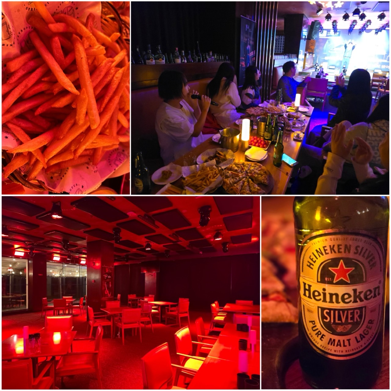 한국 노래도 가능하고, 최신곡만 빼면 웬만한 곡은 다 있어요. 🍕 안주는 피자, 치킨, 감자튀김 등 가볍게 즐기기 좋은 메뉴들이 준비되어 있습니다.