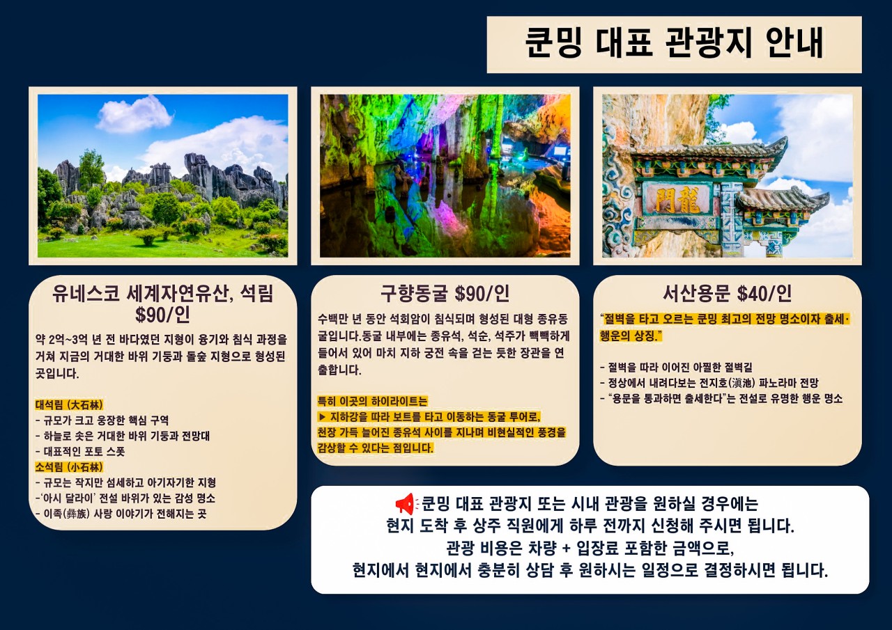 쿤밍 대표 관광지 또는 시내 관광을 원하실 경우에는 현지 도착 후 상주 직원에게 하루 전까지 신청해 주시면 됩니다.