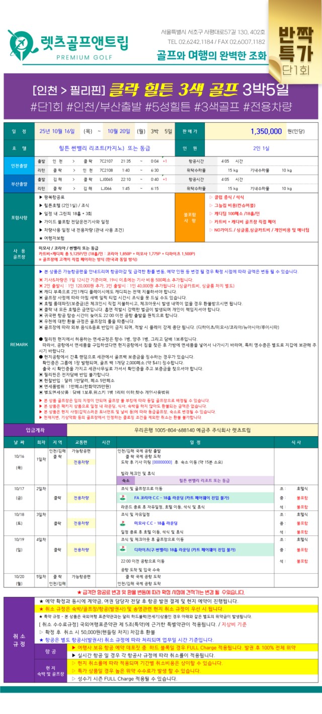 🎀필리핀 클락 힐튼 3색 골프 패키지