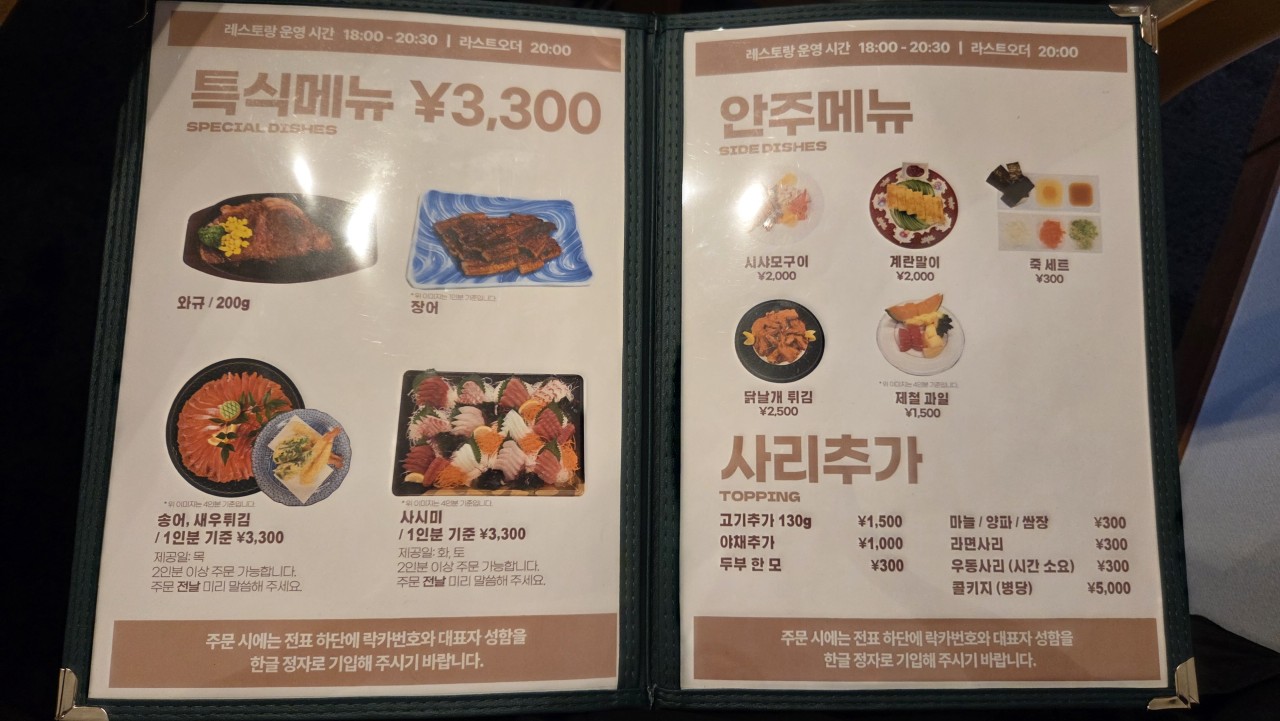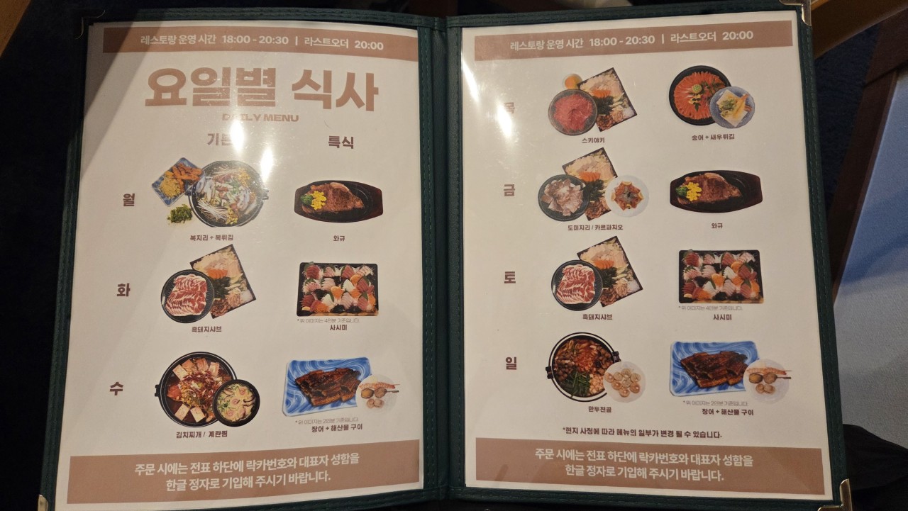 - 석식특식제공(사시미, 와규, 장어구이)