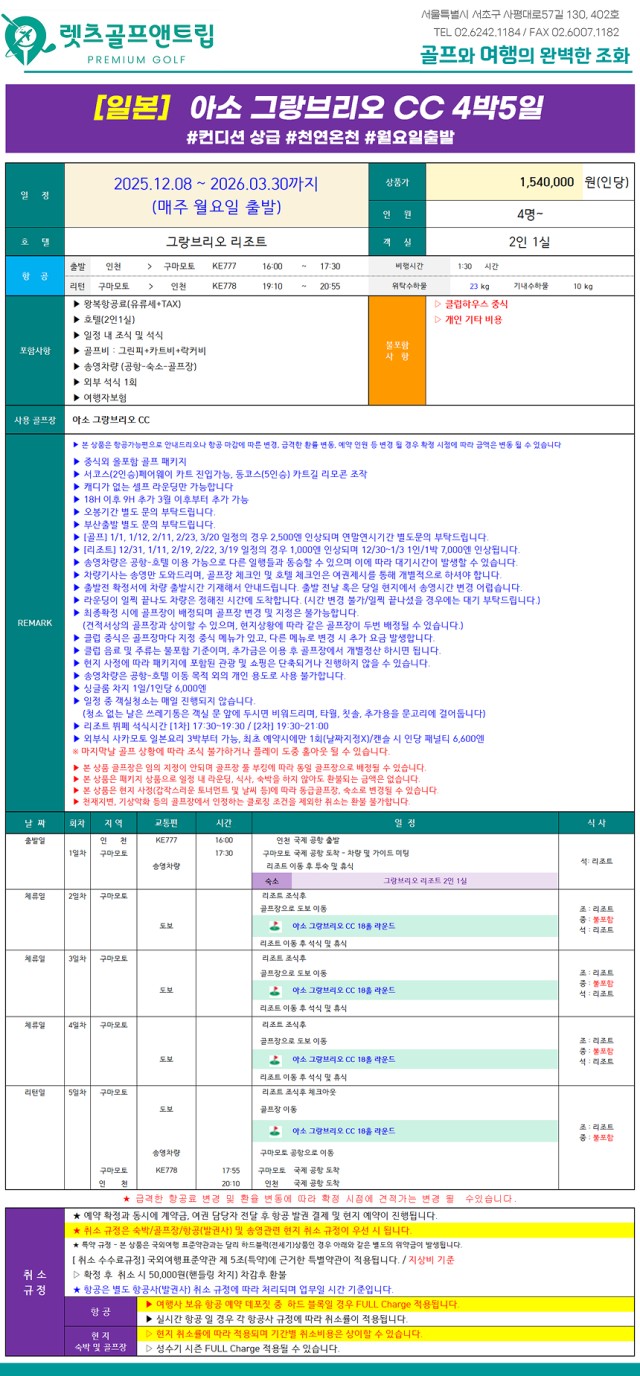 일본/구마모토 아소그랑뷔리오cc 25년 12월-26년 3월 3박4박패키지