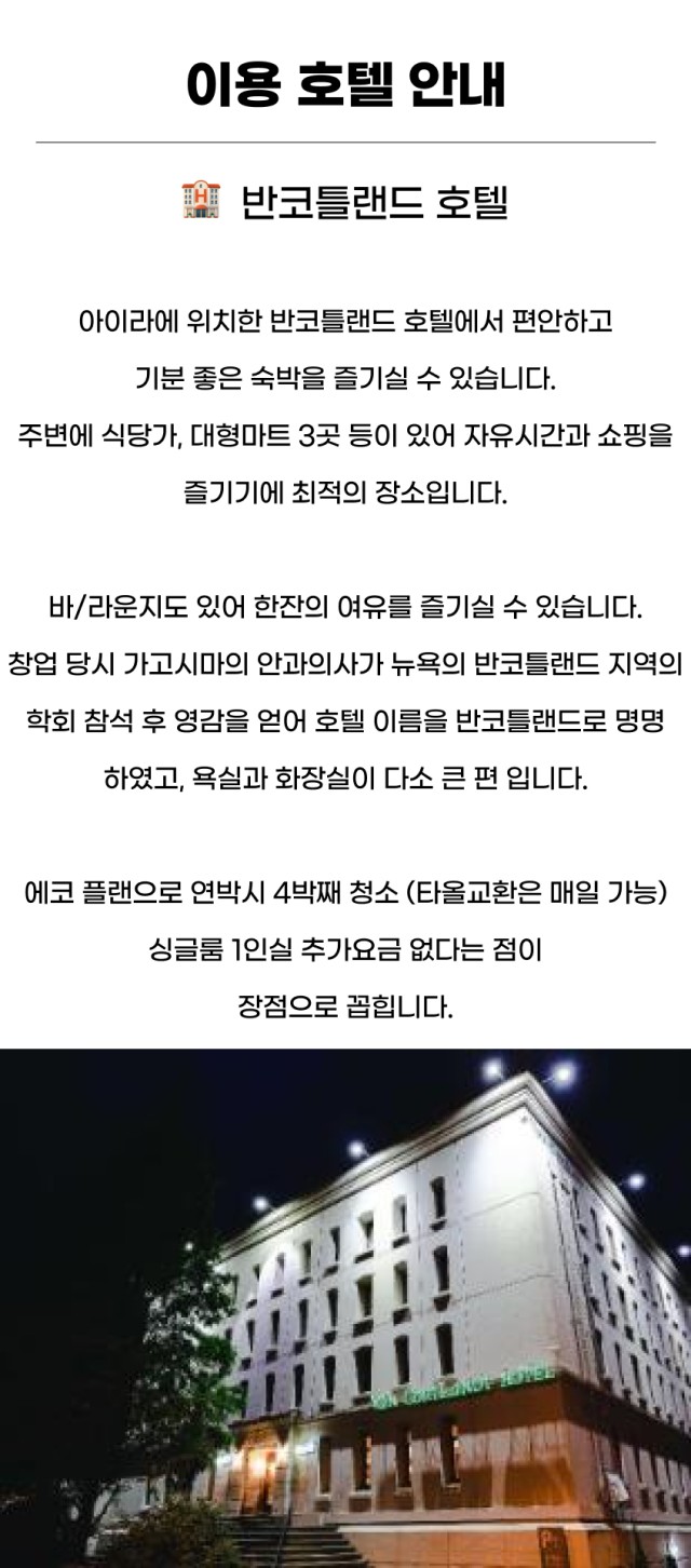 🏢호텔 : 아이라이쿠호텔(2인1실) OR 반코틀랜드 호텔(1인1실)