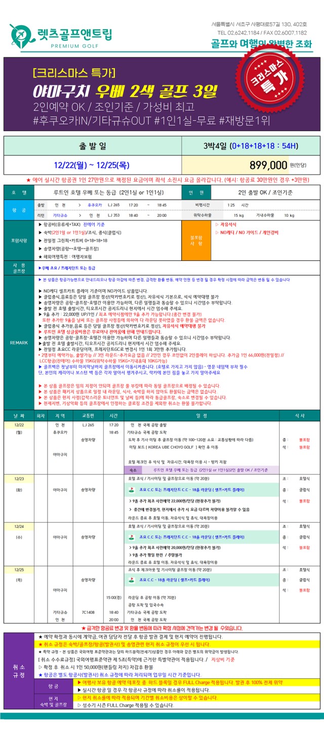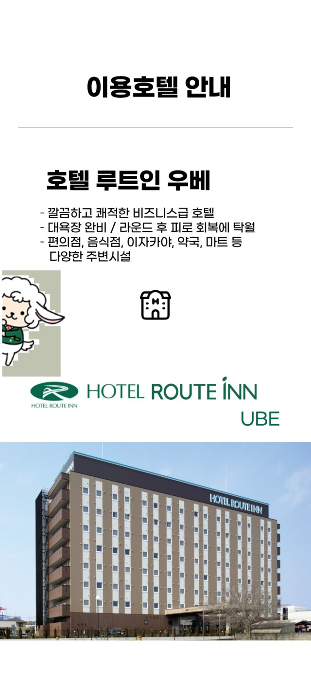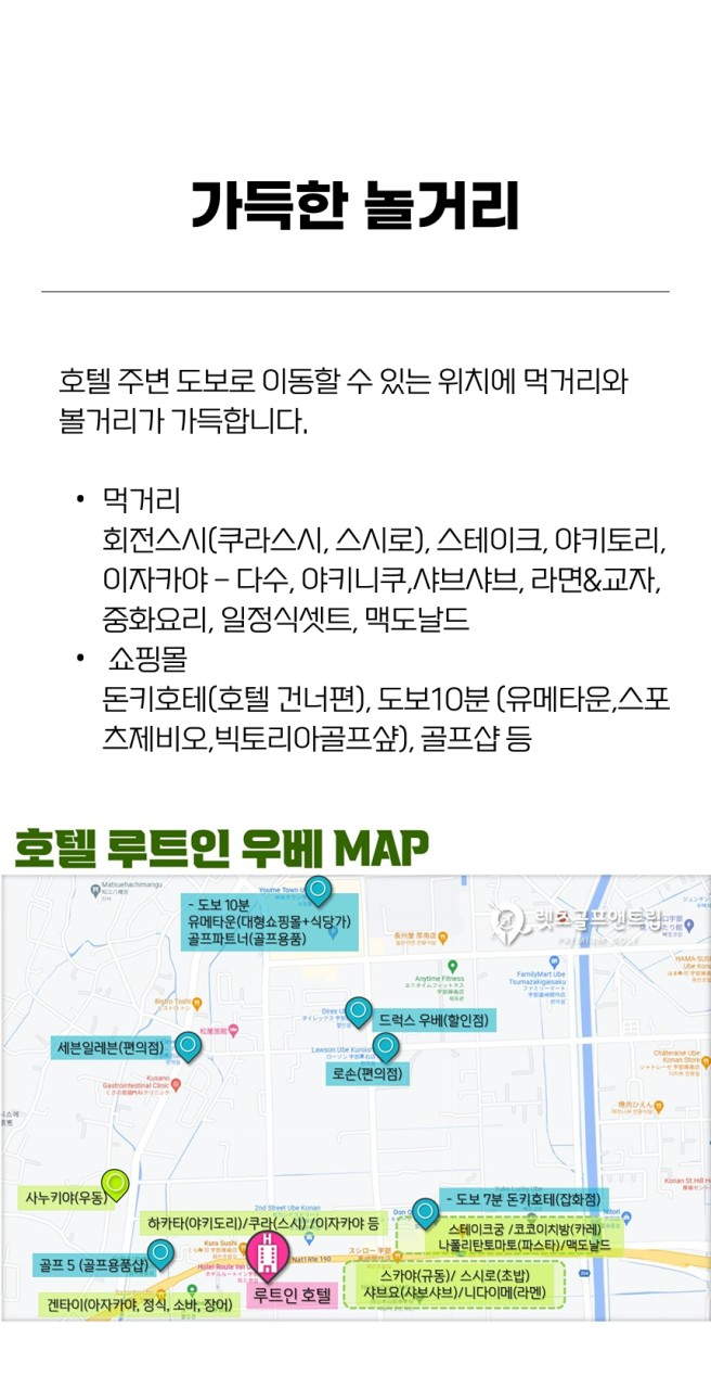 항공료, 루트인 호텔 우베, 조식, 대욕장, 그린피+카트피+락카피, 송영차량