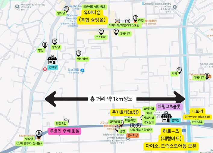 돈키호테(호텔 건너편), 도보10분 (유메타운,스포츠제비오,빅토리아골프샾), 골프샵, GOLF 5, 돈키호테, 라면교자, 쿠라스시(체인점), 빠칭코, 샤브요, 스바라시 진세이 (이자카야), 쿠라모토 - 고급 야키니쿠, 유메타운 (쇼핑타운 + 골프 샾 위치) 등