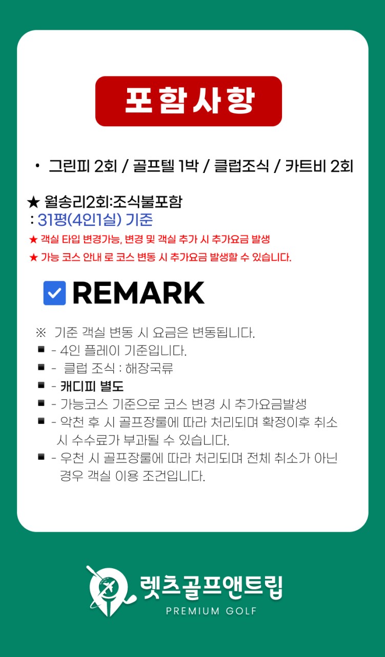 ※ 우천 시 골프장 룰에 따라 적용되며 객실 사용 조건입니다.