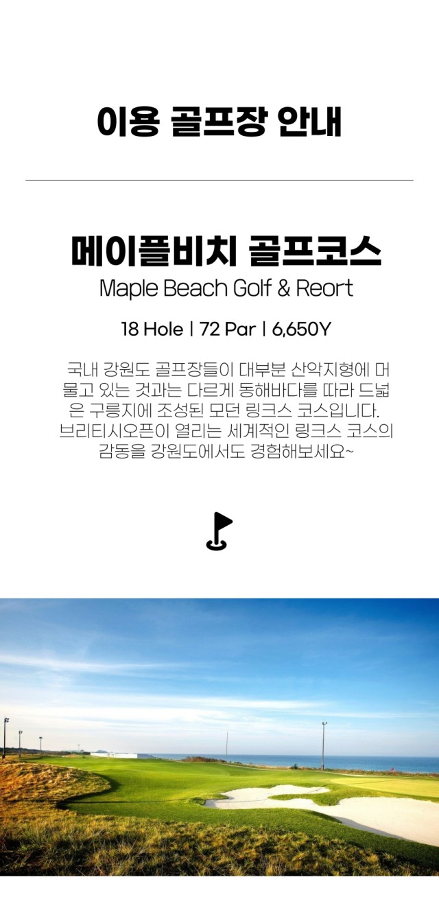 거대한 호수를 때로는 양 옆에 끼고 때로는 가로지르며 플레이해야하는 메이플코스 푸르른 장관이 더 없는 아름다움을 선사하고 거친 억새와 러프를 이겨야하는 긴장감 넘치는 매력적인 코스