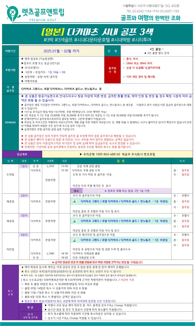 1️⃣골프장은 체류 기간동안 다카마츠 그랜드cc, 로얄 다카마츠cc, 다카마츠 골드cc, 만노힐즈cc 중 세곳을 이용하고 현지 사정상 다른 동급의 골프장으로 대체될 수 있습니다.
