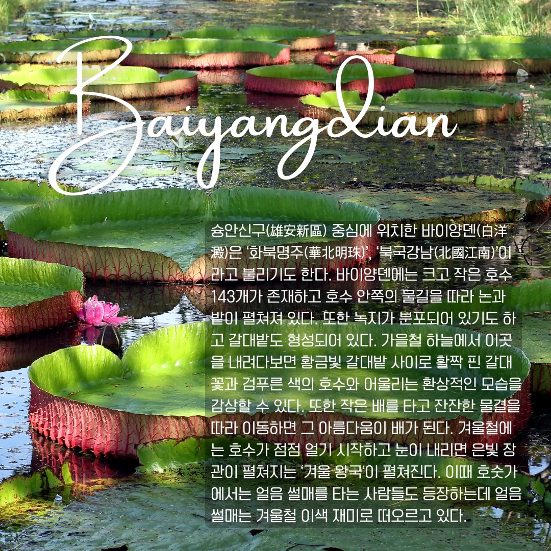 연꽃대경원, 원앙섬, 민속원, 문화원 등의 경치 좋은 명소와 문화 경관이 있습니다. 바이양뎬은 북중국 평원의 가장 큰 담수호이자 습지 생태계로서, 수자원 보존, 홍수 완화, 지역 미기후 조절, 생물다양성 유지 등의 기능을 가지고 있어 북중국의 생태환경을 유지하는 데 큰 의미가 있습니다.