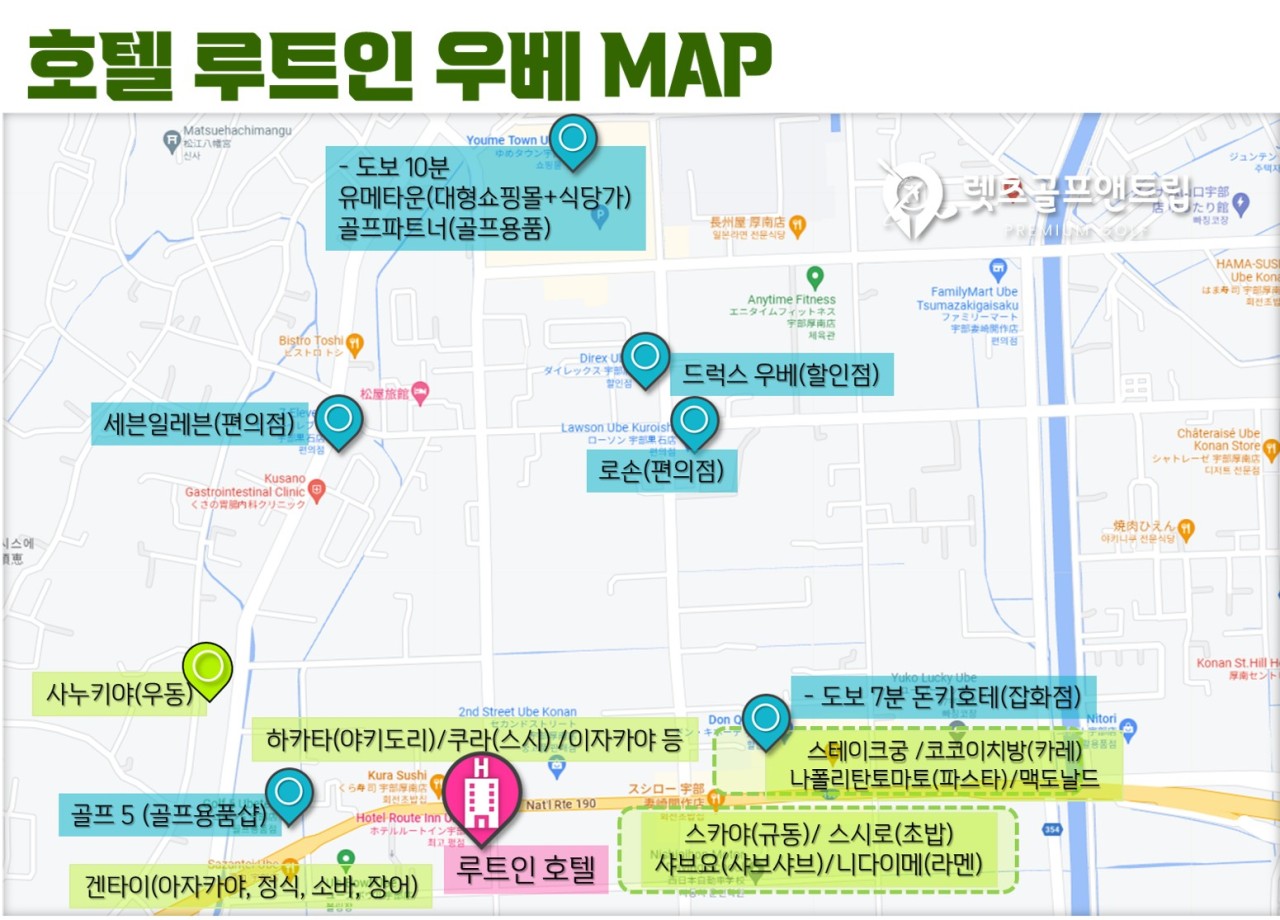 돈키호테(호텔 건너편), 도보10분 (유메타운,스포츠제비오,빅토리아골프샾), 골프샵 등