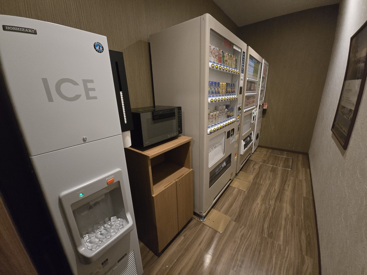 호텔 부대시설로는 대욕장이 있고 그 앞에는 다양한 자판기가 있어요~ 가장 좋은건 전자렌지, 제빙기가 있어 좋았어요~ 대욕장 내부에는 건조기도 있어 장박하시는분들한테 아주 좋습니다.