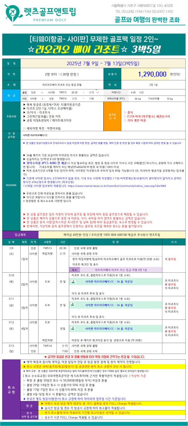 ⛳️사이판 라오라오베이 골프리조트⛳ <3박5일> 💛무제한 골프팩💛