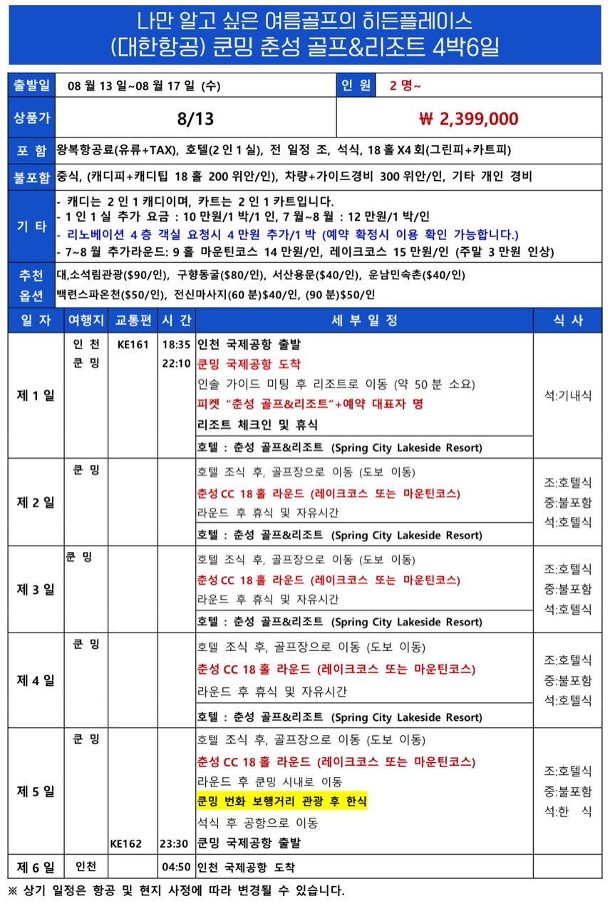 📍 쿤밍 춘성 골프&리조트 4박6일
