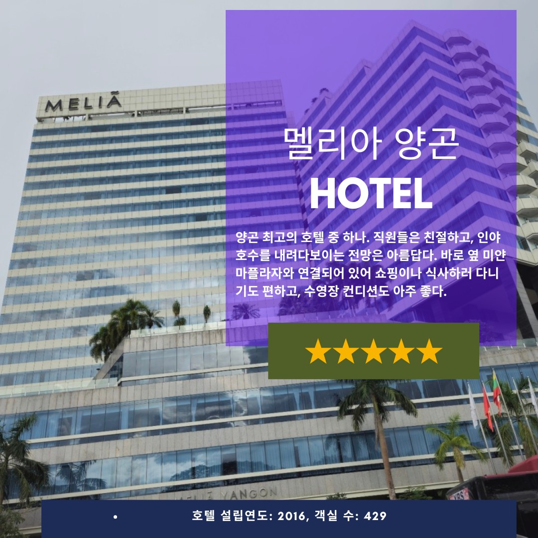 양곤 최고의 호텔 중 하나. 직원들은 친절하고, 인야호수를 내려다보이는 전망은 정말 최고이다. 비로 옆 미얀마플라자와 연결되어 있어 쇼핑이나 식사하러 다니기도 편하고, 수영장 컨디션도 아주 좋다. 멜리아 양곤에 머무르시면 바한을 둘러보시기에 더없이 좋은 위치에서 머무시게 됩니다.