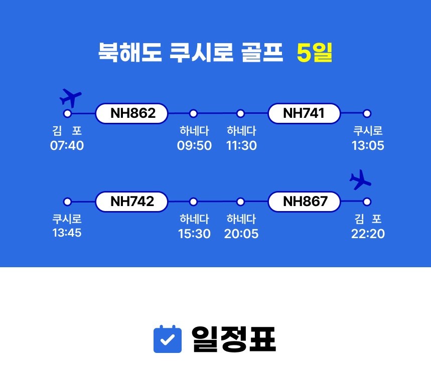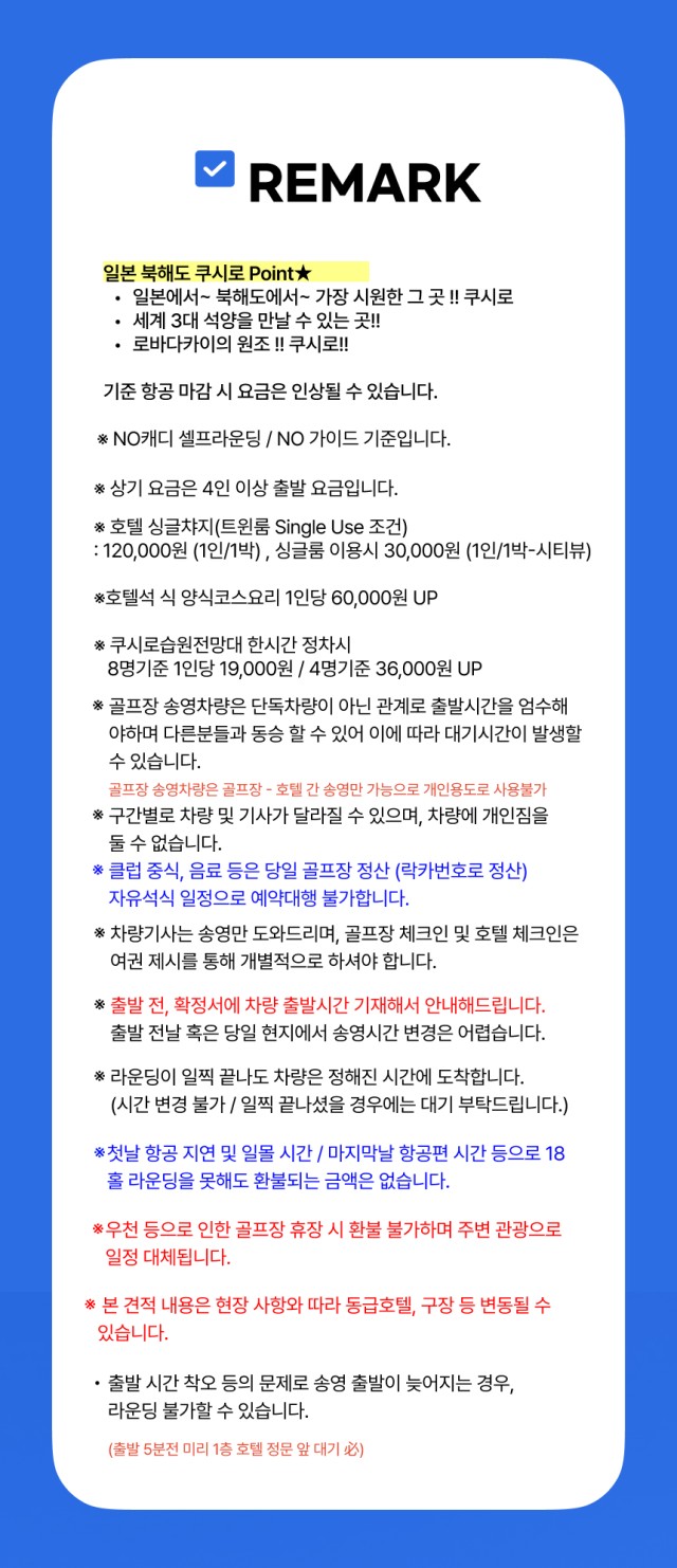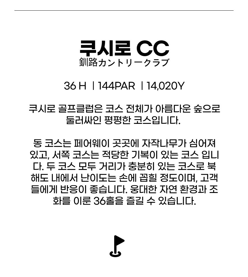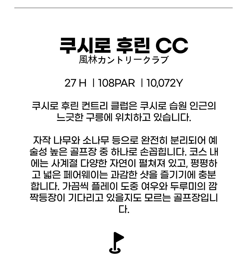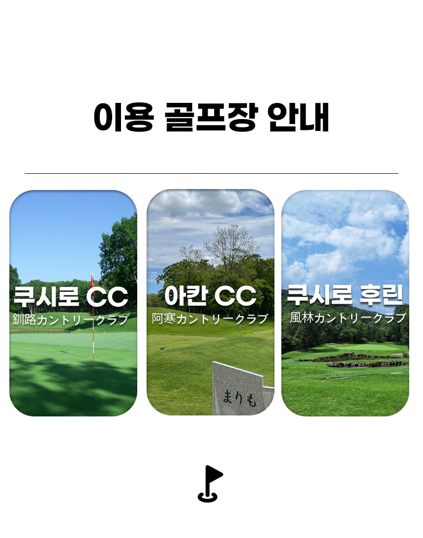 체류일은 가급적 18홀만 하고 쿠시로 시내관광, 쇼핑몰 이용하시기를 권해드립니다. 가이드가 없는 투어이기 때문에 출발전 쿠시로 시내지도와 맛집안내문등도 배포해 드리고
