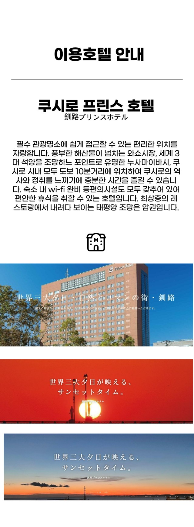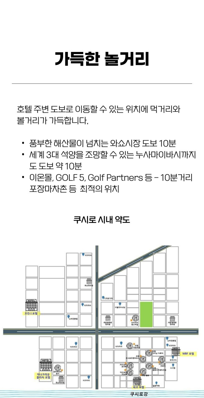 이온몰,골프5등 쇼핑몰이 택시로 약 10분거리에 있어 골프라운드후 쇼핑과 식사를 동시에 해결할수 있습니다. 프린스 호텔의 트윈룸은 모두 태평양 오션뷰를 향하고 있어 세계 3대 석양인 쿠시로의 석양을 객실에서 감상할수 있습니다.