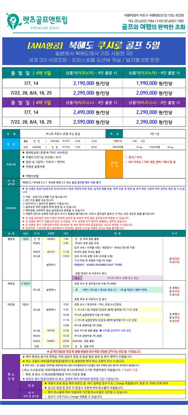 일본/쿠시로 아칸, 쿠시로, 쿠시로후린CC 7-8월 4박5일패키지