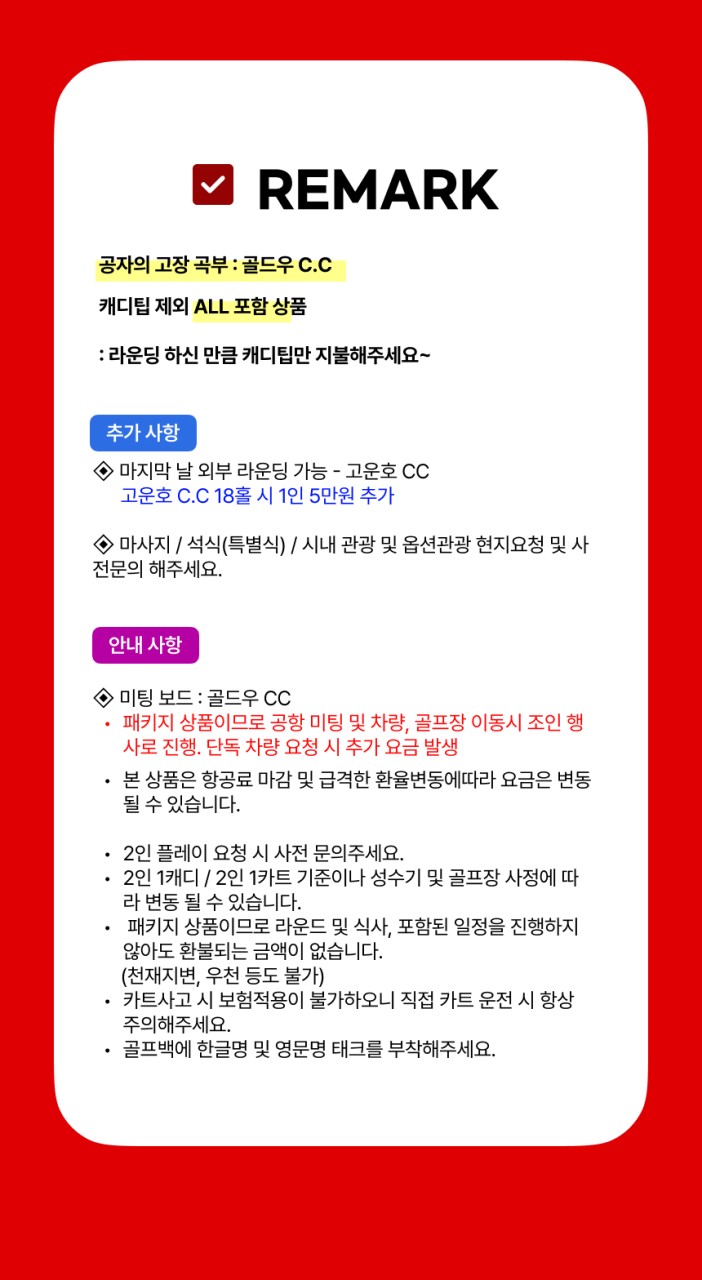 * 마지막날 외부라운드 가능, 고운호cc 18홀시 5만원 추가