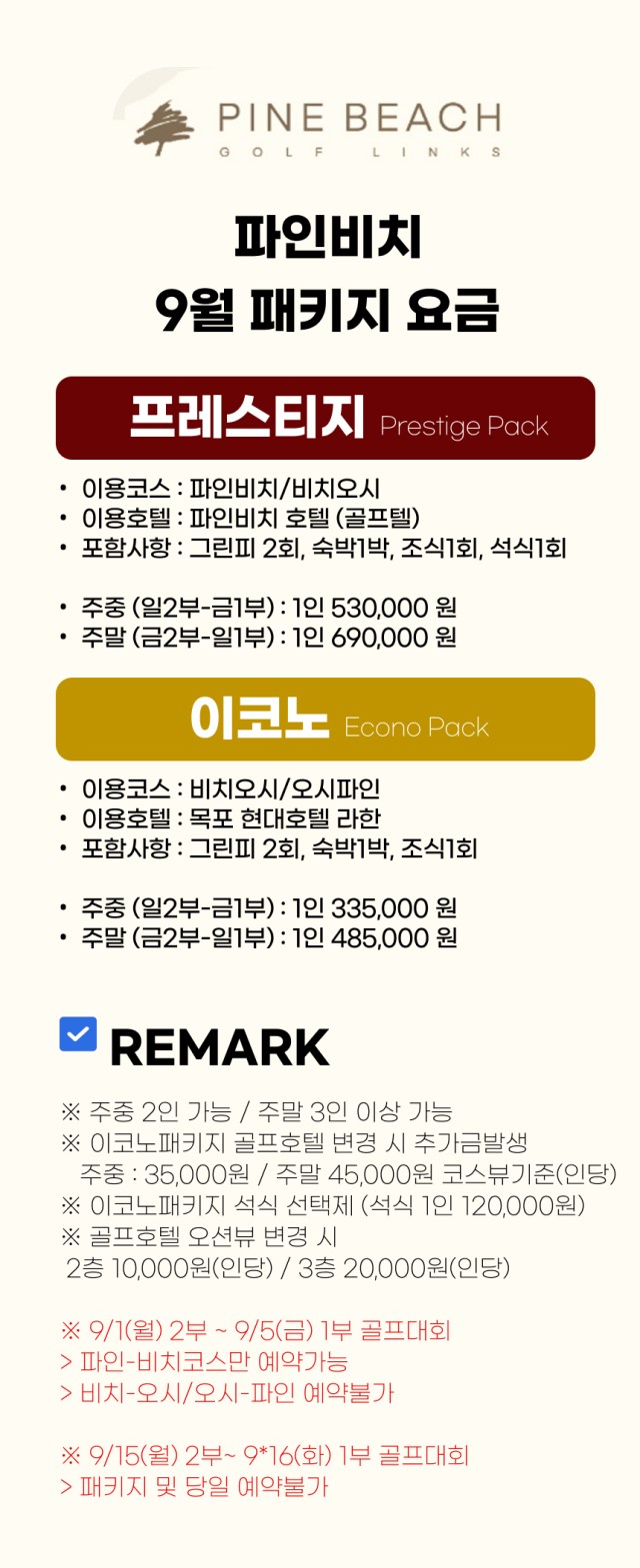 그린피 36홀 / 파인비치 골프텔(2인1실) / 조식 1회 / 석식 1회