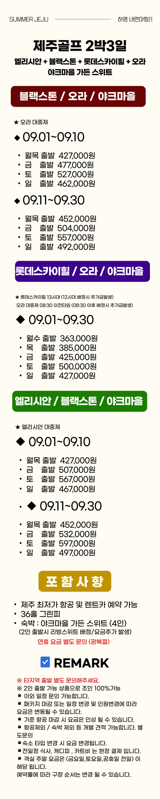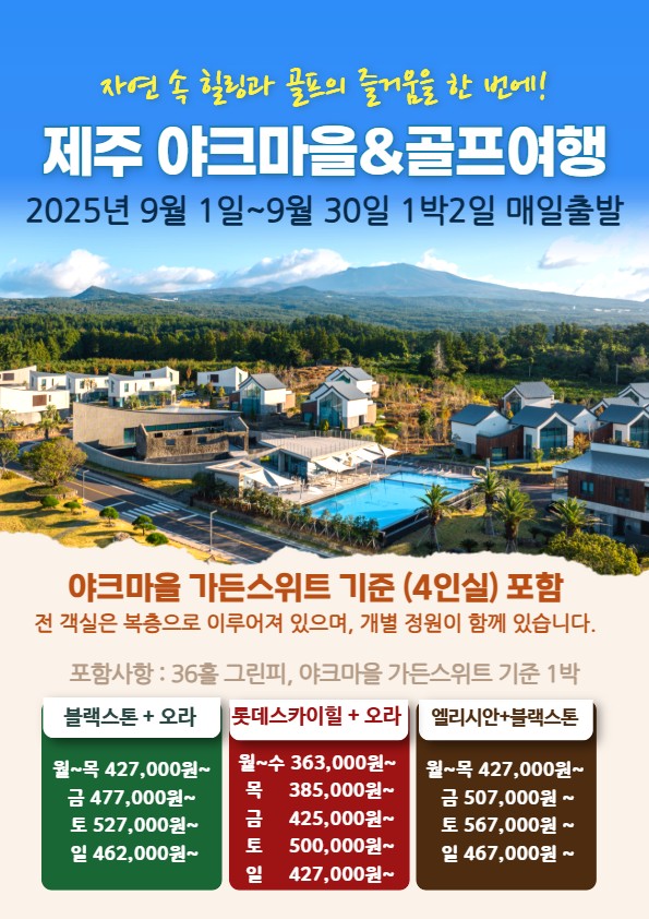 9월 오름과 제주 바다를 닮은 야크마을(블랙야크)에서 함께하는 제주명문 골캉스 1박 2일 패키지
