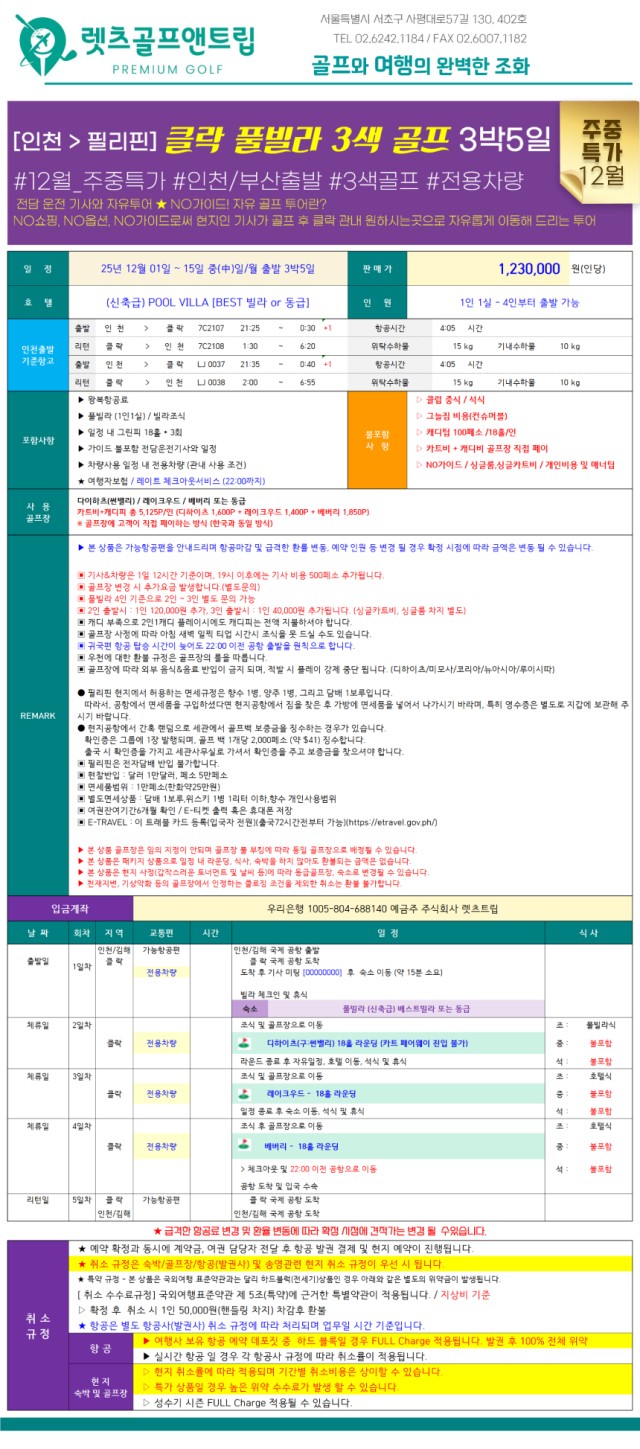 🌸필리핀(클락) 12월 [주중특가] 풀빌라(3색)&자유투어 골프