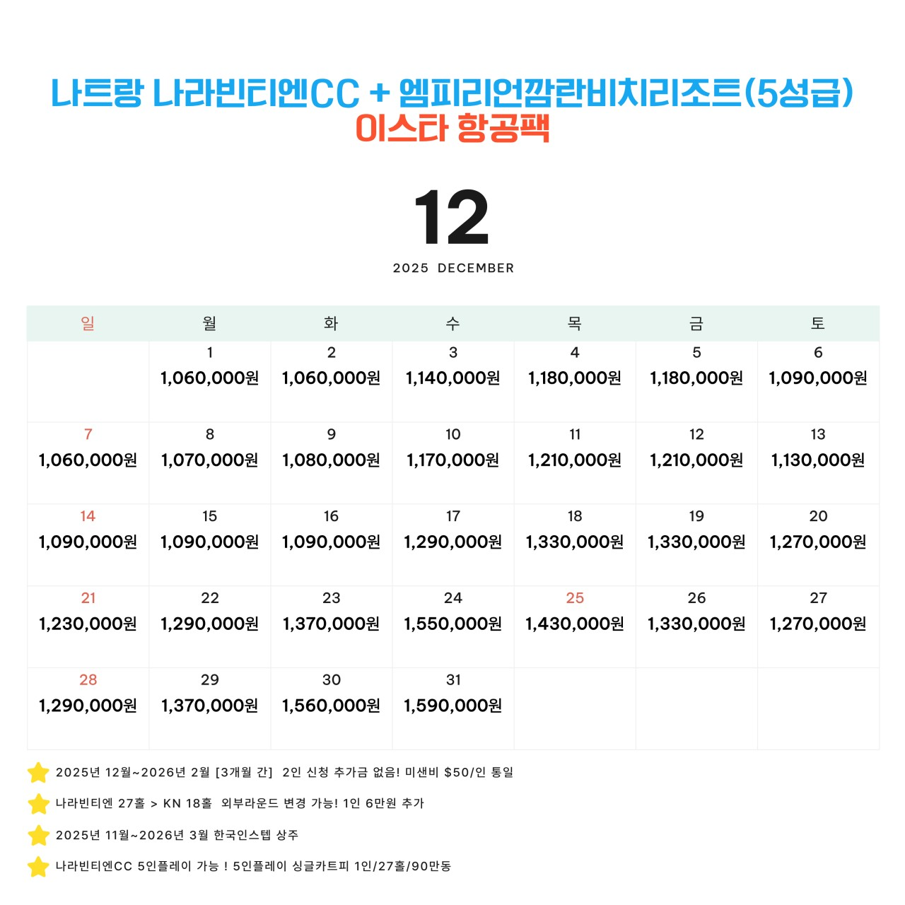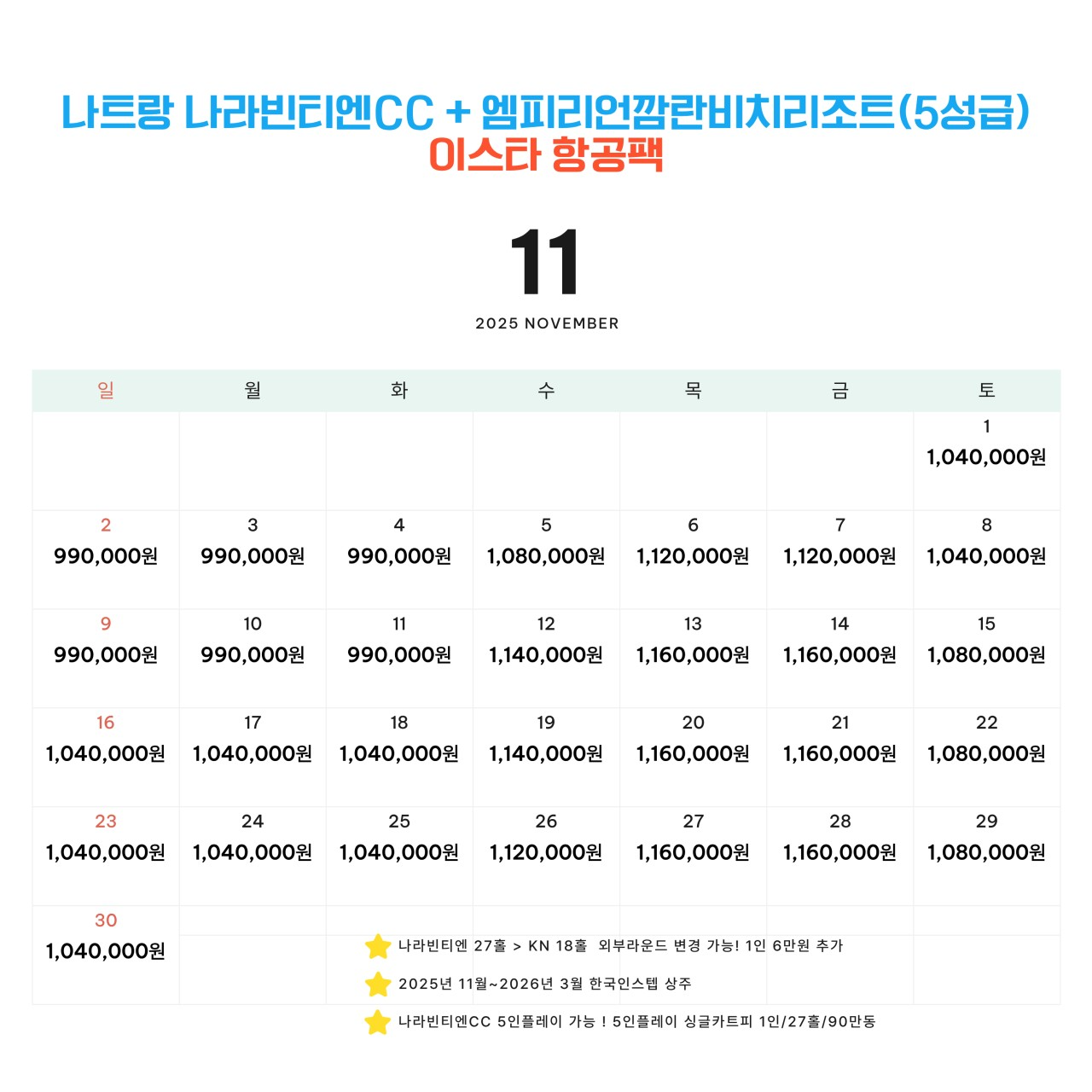 🔔나트랑 나라빈티엔골프 25년11월~26년3월 이스타 3박5일 항공팩 [99만원~]