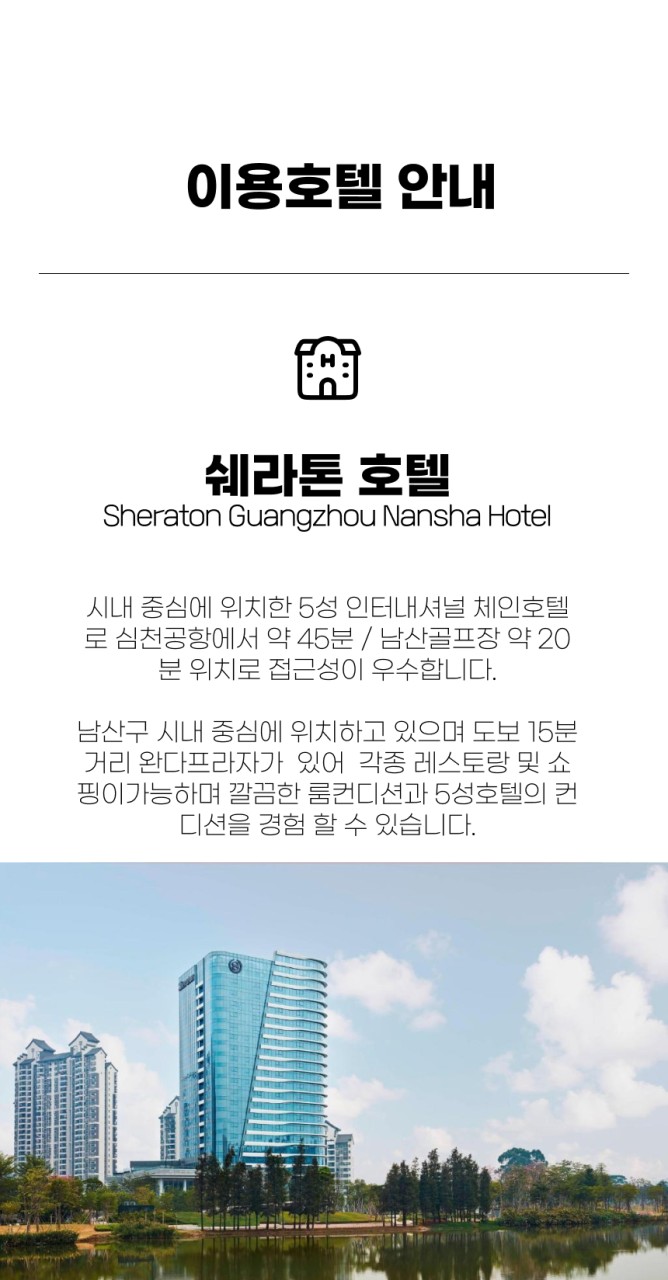 9️⃣숙박은 쉐라톤 호텔 또는 남사 리조트 두 곳 중 한 곳에서 선택 가능합니다.