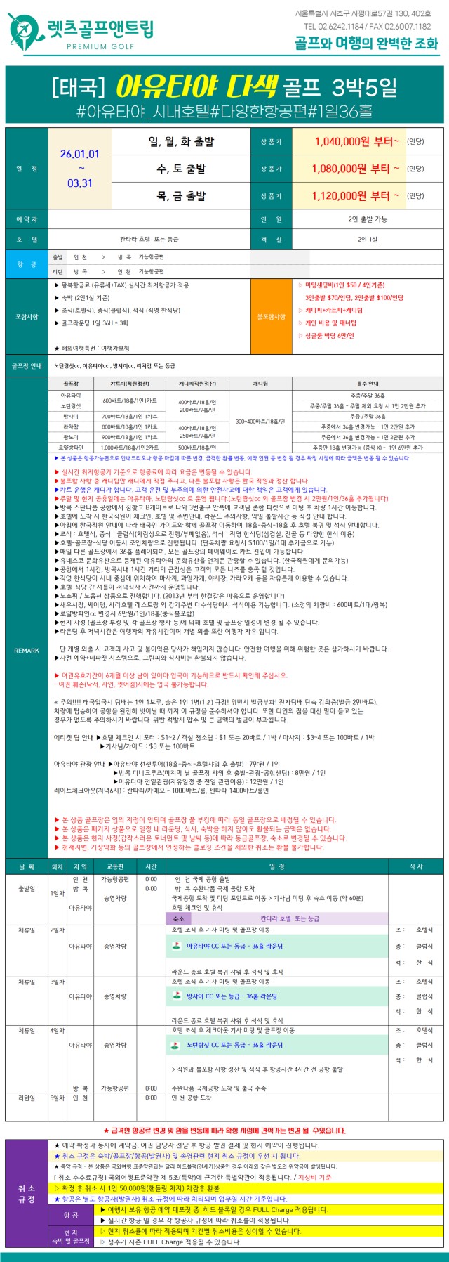 ■ 기본 방사이, 노턴랑싯, 아유타야 순으로 구장 마감이나 변경에 따라 요금변동