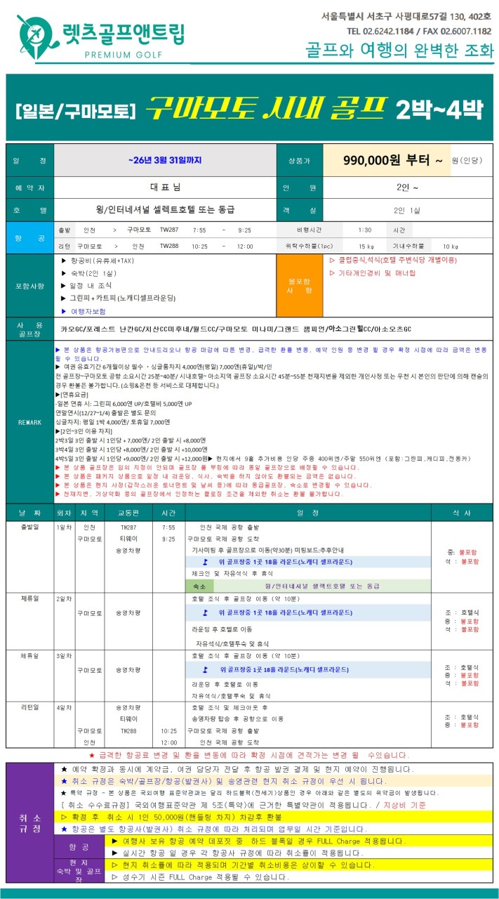 - 일본 연휴 시 : 그린피 6,000엔 UP / 호텔비 5,000엔 UP