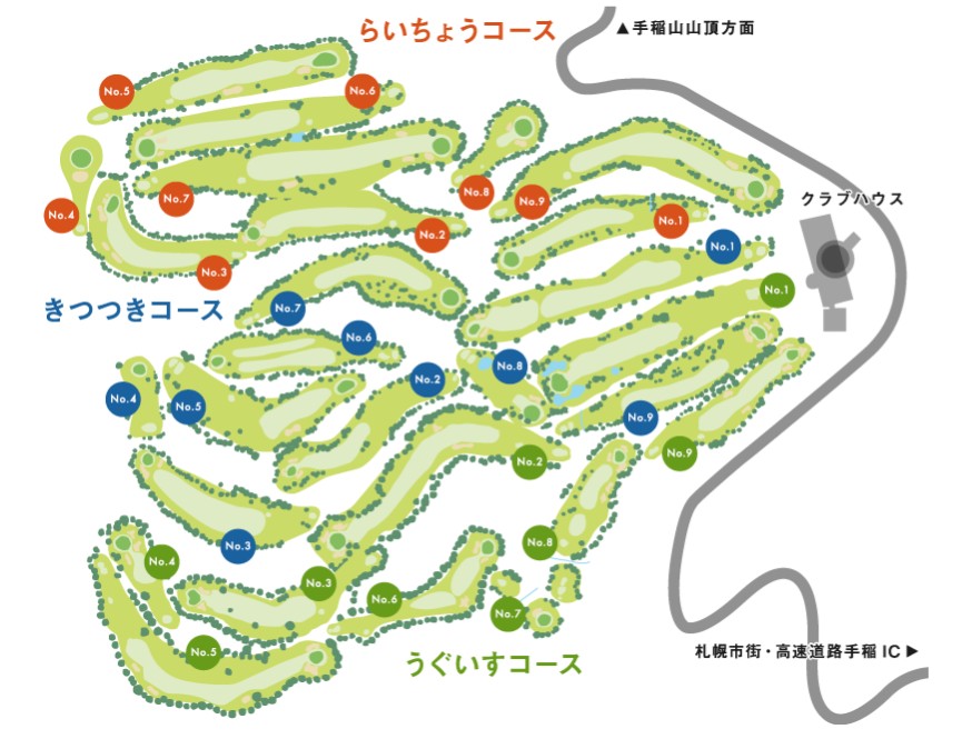 많은 홀에서 이시카리만을 내려다 볼수 있고, 스트레이트 홀이 많아 정확한 샷으로 좋은 스코어를 기대할수 있다. 이코스의 명물홀인 6번홀의 2단그린은 매우 드문 그린입니다.