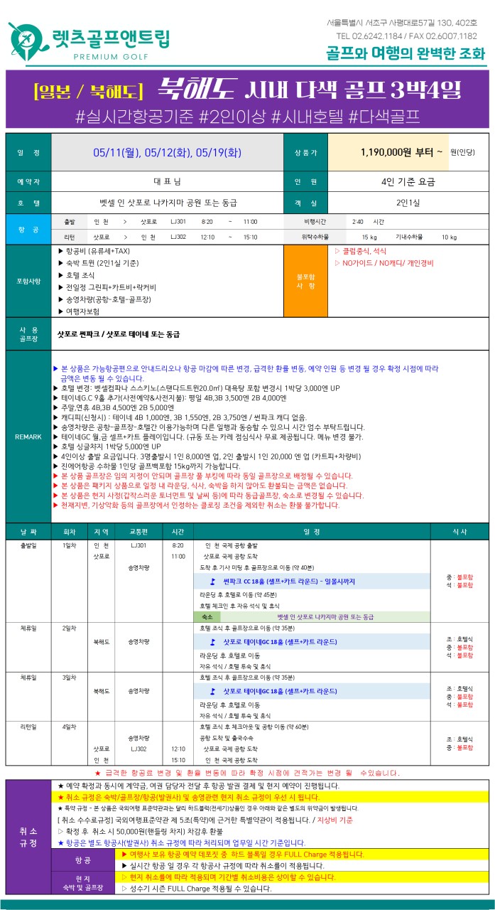 ※ 4인 기준 요금으로 3인 출발시 1인 8,000엔 추가, 2인 출발시 1인 20,000엔 추가 됩니다.