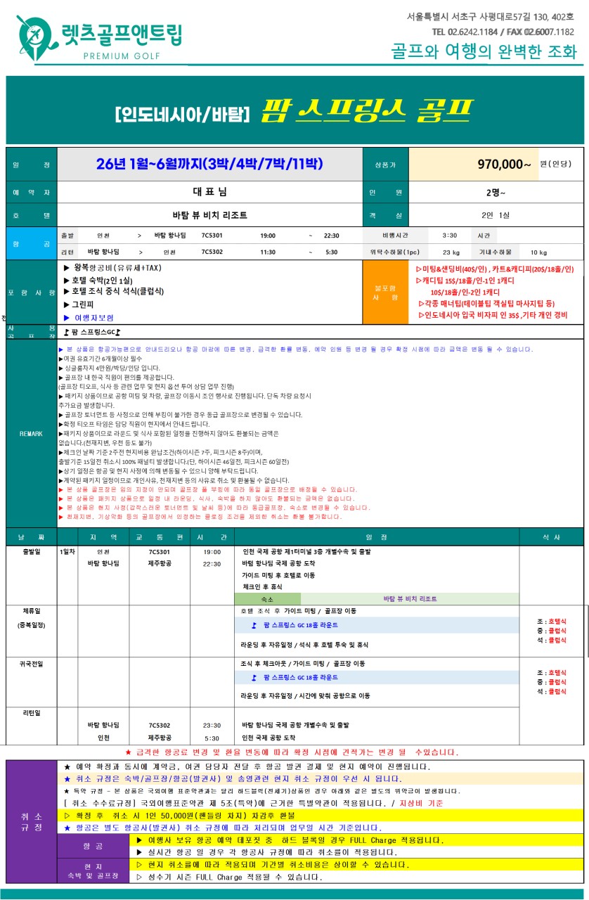 - 패키지 상품이므로 라운드 및 식사, 포함된 일정을 진행하지 않아도 환불되는 금액이 없습니다. (천재지변, 우천 등도 불가)