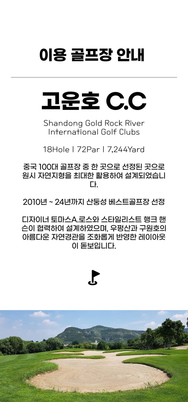 2010년~ 2024년까지 산둥성 베스트 골프장으로 선정이 되어으며, 해발 350M 의 고지대에 위치하고 있습니다. 자연지형을 그대로 살린 코스로 레이아웃이 아주 재미 있는 곳입니다.