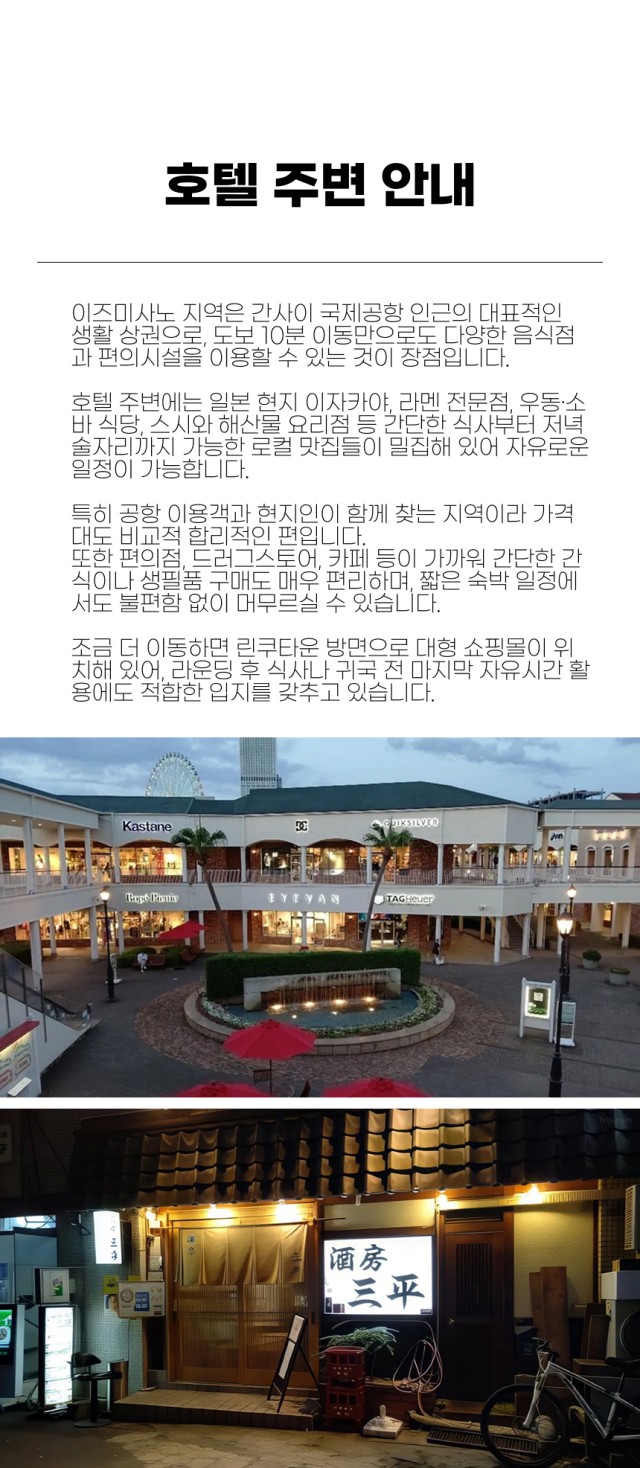 이즈미사노 지역은 간사이 국제공항 인근의 대표적인 생활 상권으로, 도보 10분 이동만으로도 다양한 음식점과 편의시설을 이용할 수 있는 것이 장점입니다.