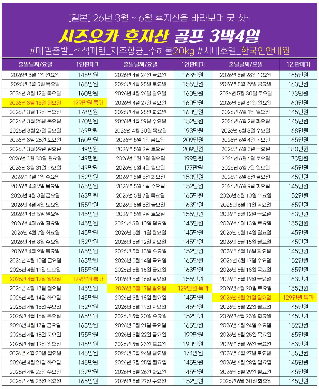 🔔3~9월 매일출발 2박 3박 4박 지상비/항공팩 견적가능
