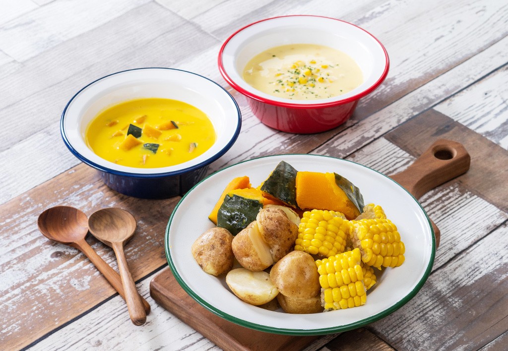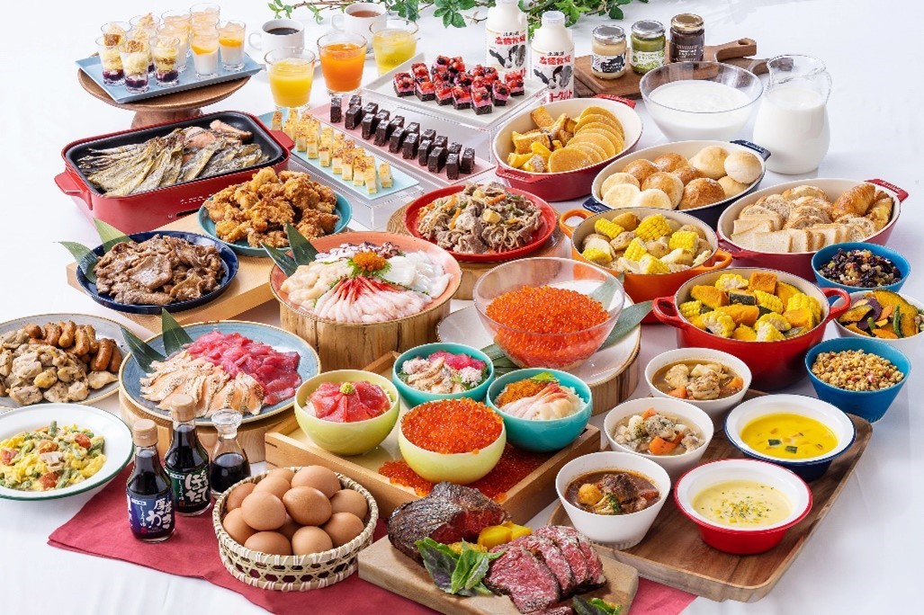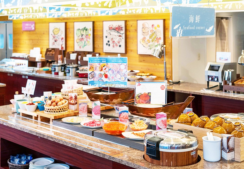 북해도의 맛있는 매력을 찾아볼수 있는 조식.풍부한 해산물뿐 아니라 북해도 각지의 다양한 식재료를 활용.