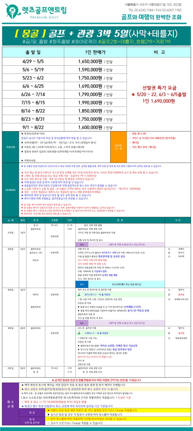 ♣몽골골프장은 정부기관의 긴급행사가 있으면, 부킹예약을 일방적으로 취소하는경우가 간혹잇습니다. 참고부탁드립니다.