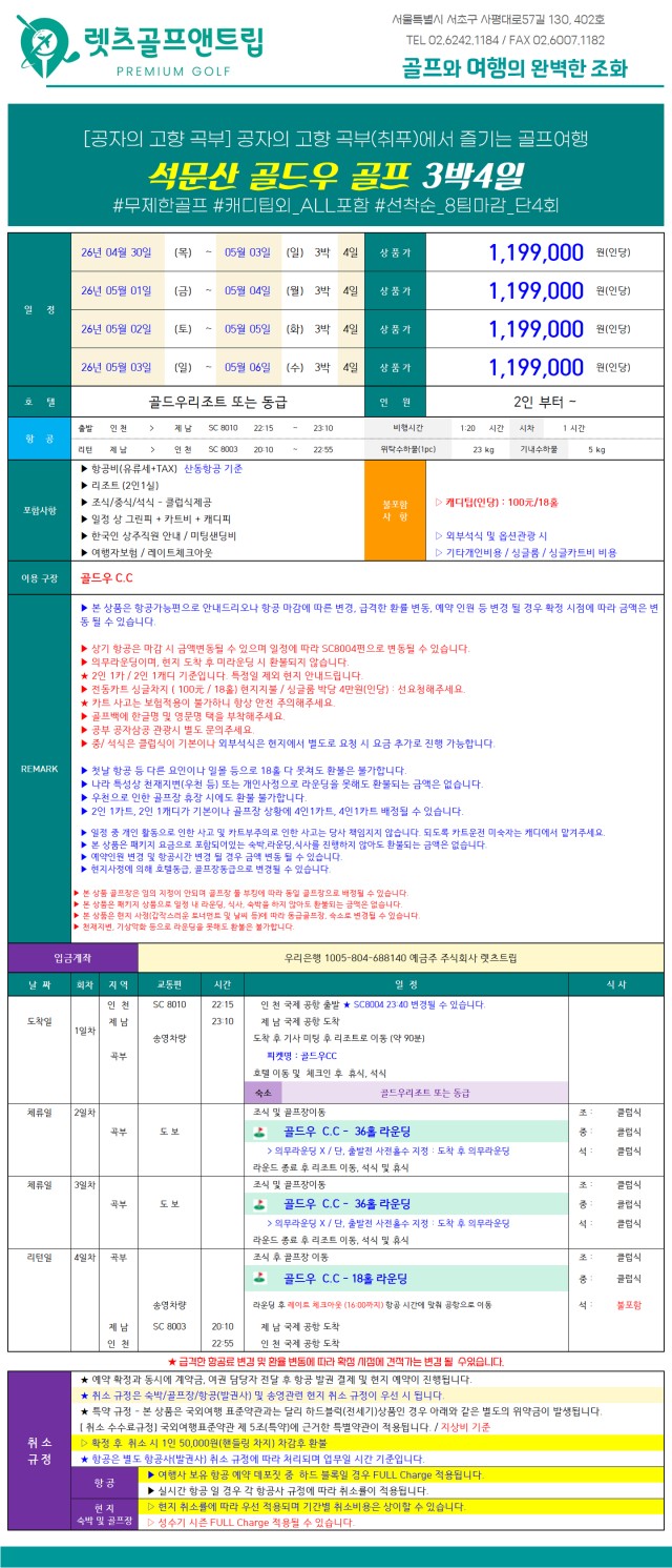 ● 패키지 상품으로 포함된 식사, 송영, 숙박, 골프 등을 사용하지 않아도 환불금은 없습니다.