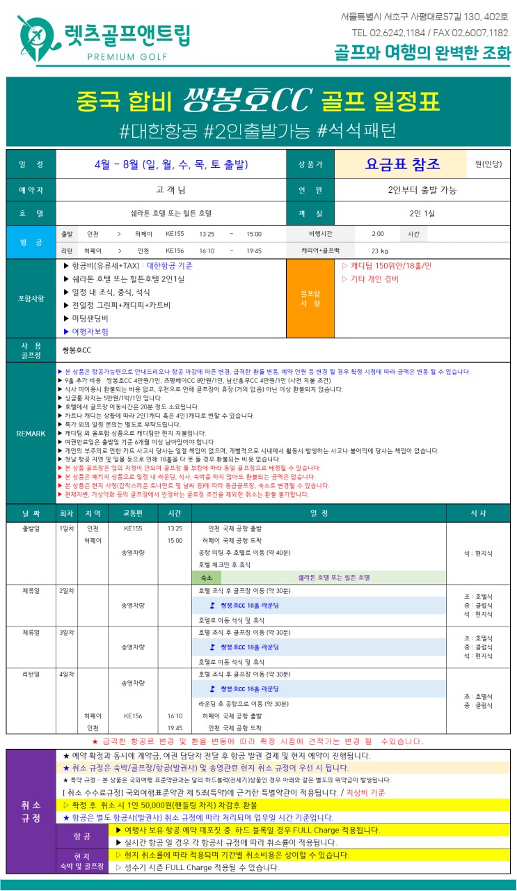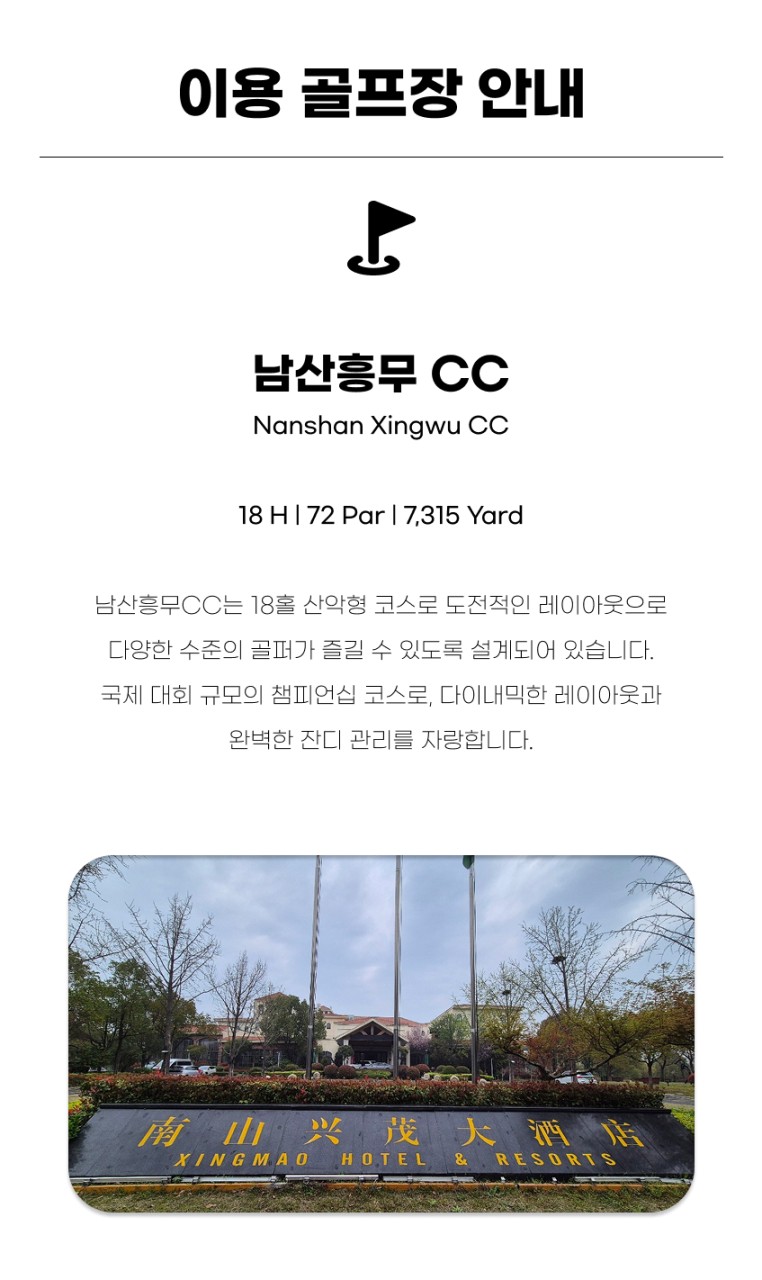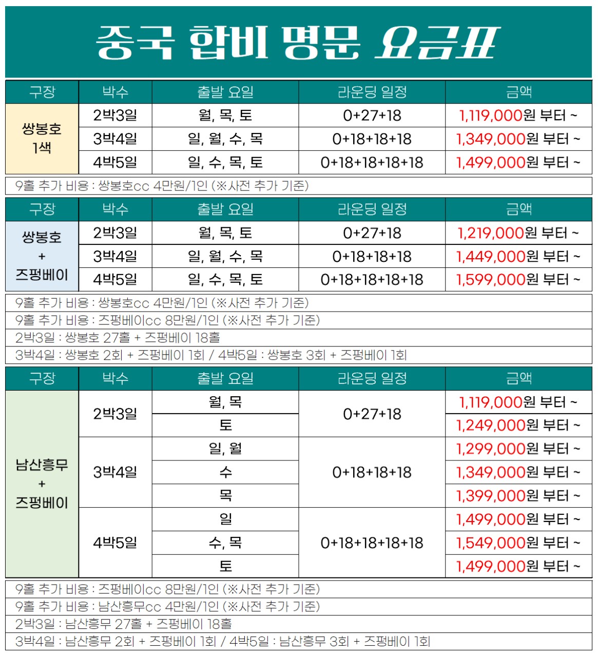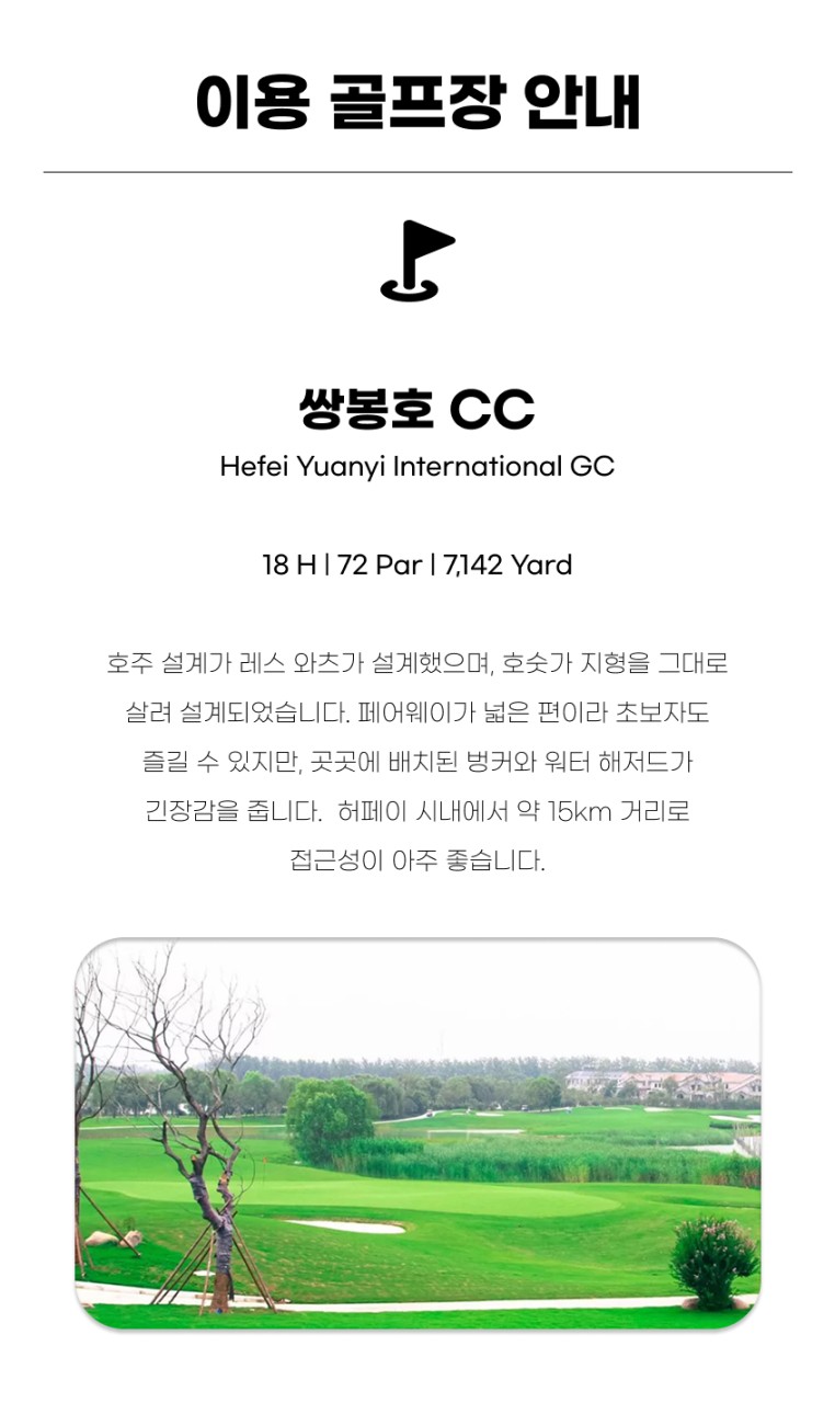 ▶ 9홀 추가 비용 : 쌍봉호CC 4만원/1인, 즈펑베이CC 8만원/1인, 남산홍무CC 4만원/1인 (사전 지불 조건)